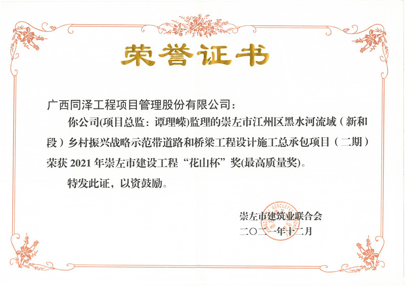 崇左市江州區黑水河流域(新和段)鄉村振興戰(zhàn)略示范帶道路和橋梁工程設計施工總承包項目(二期)項目榮獲2021年崇左市建設工程“花山杯”獎(最高質量獎)
